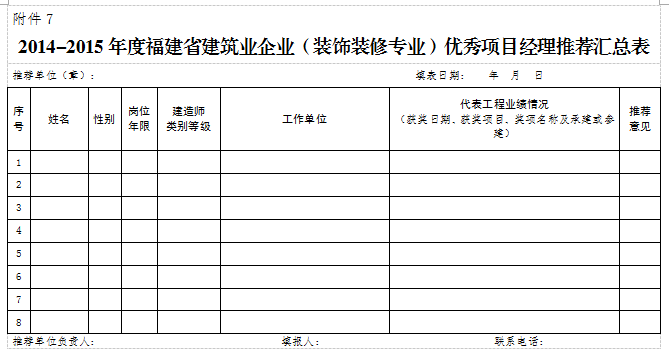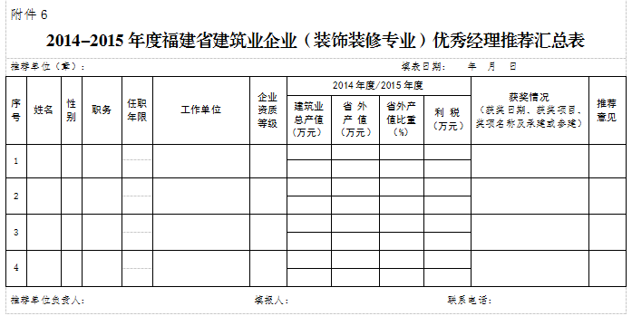 ㈠《2014-2015年度福建省建筑业企业(装饰装修专业)优秀项目经理申报表》(附件4);