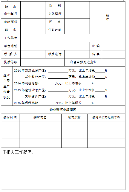 ㈠《2014-2015年度福建省建筑业企业(装饰装修专业)优秀经理申报表》(附件3);