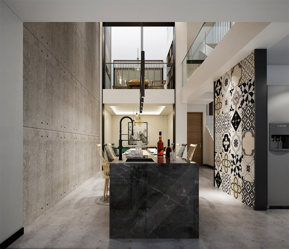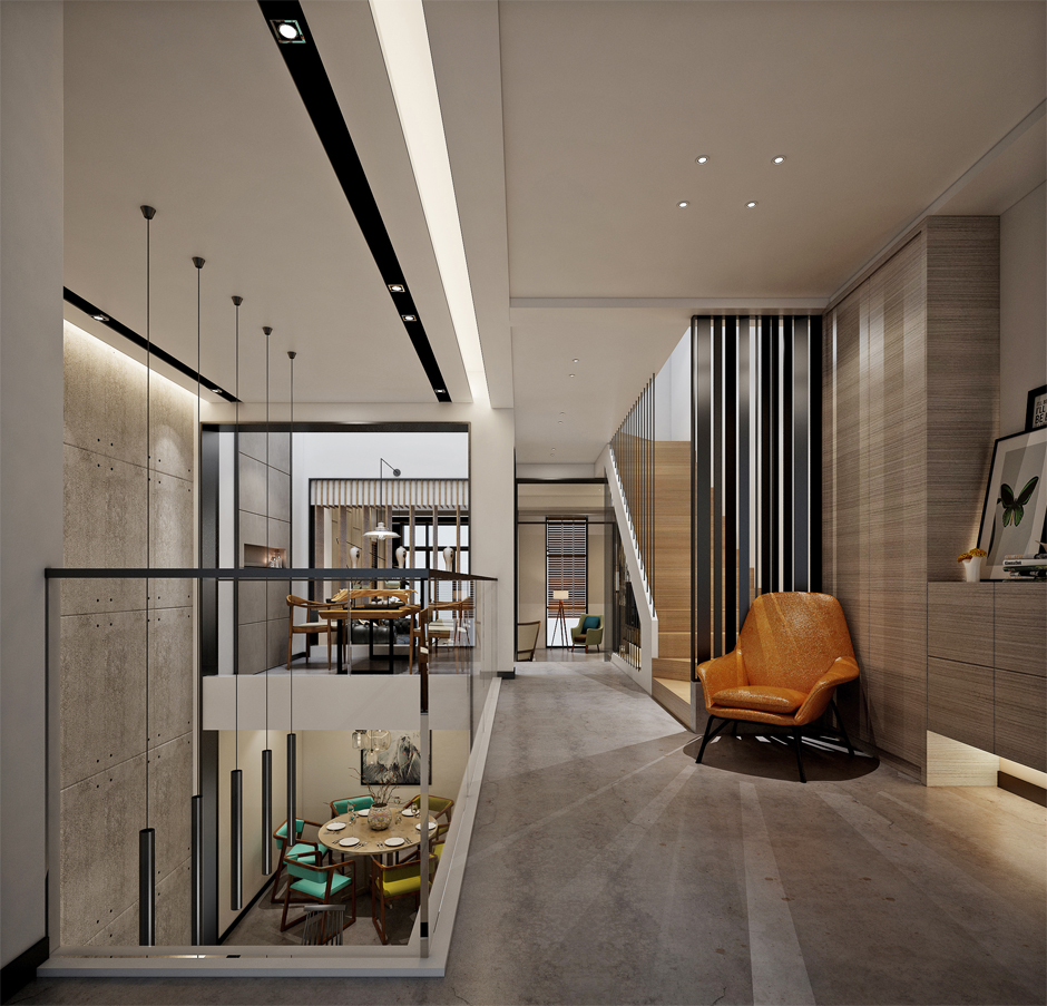 小餐厅和厨房都安排到了地下室,利用挑空区和原天井的采光通风保证了 厨房和餐厅使用起来不至于潮湿和昏暗。将原天井封闭一层 就有了个泡茶的区域且泡茶区是可以直接看到天空的,边泡茶可以仰望天空 惬意无比!楼上空间是常规的起居空间!本案整体是黑白灰的现代风格定义的,大面的留白,局部黑色钢板点缀收边的同时又多了些质感,灰色地坪漆的运用 大胆前卫,玻璃栏杆的运用,让整个空间更加的通透,楼梯的栏杆用黑色钢缆来代替,个性十足。