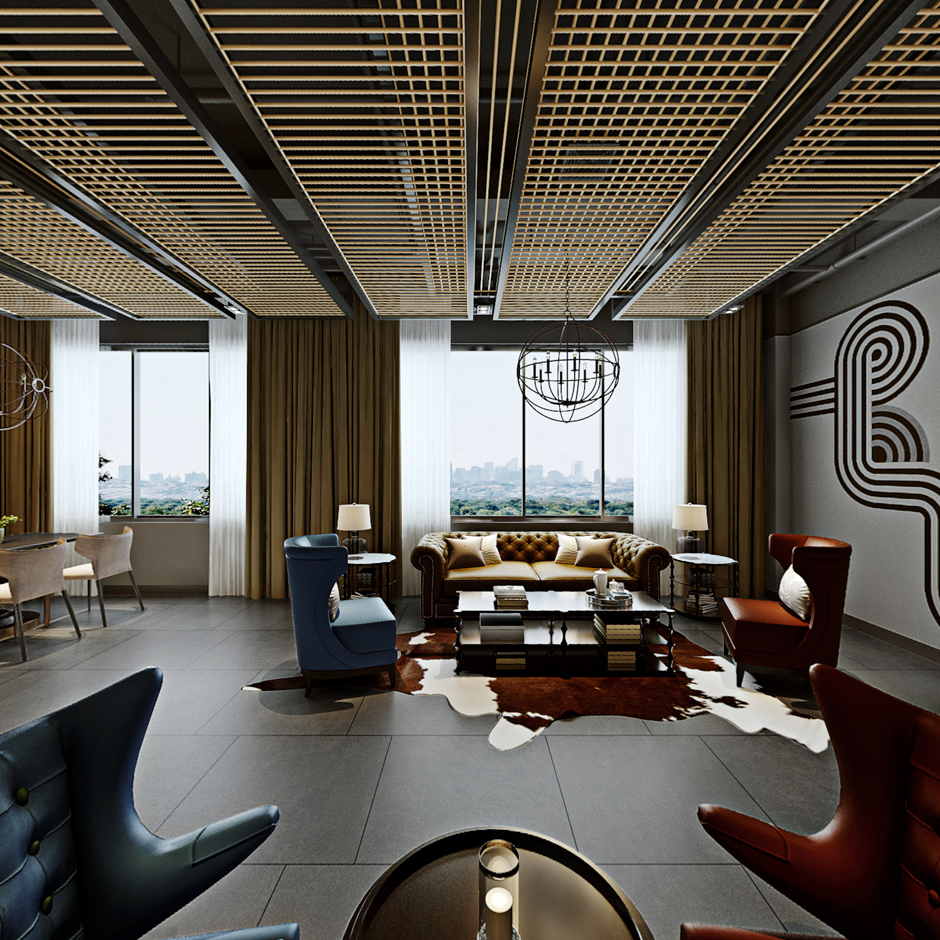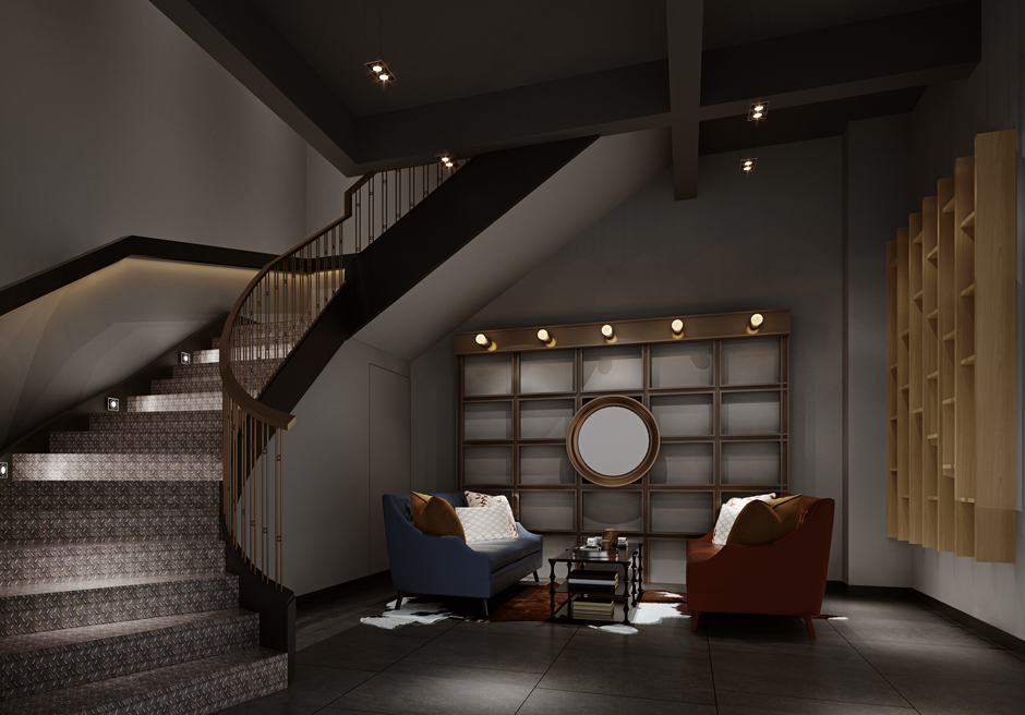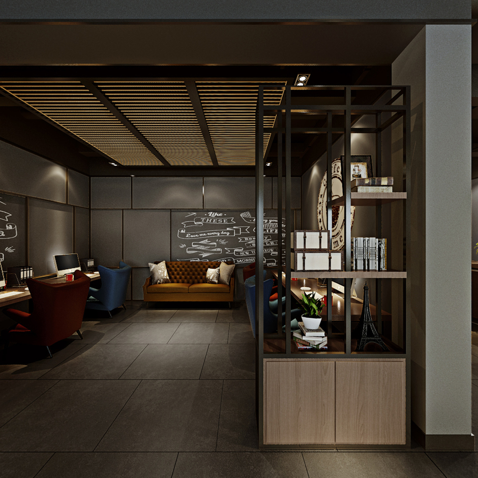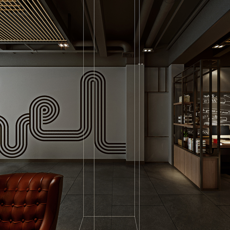 二楼主楼梯入口处设置了接待台,把客人引向各个办公区域。在整个二楼区域为了体现一种高贵稳重的氛围,因此设计上用了较多色彩,选择了咖、黑、灰等色调,软装上搭配质感的皮革沙发,与复古的挂件饰品。办公区域墙壁运用了大量涂鸦手绘,青春活力,减少了工作之余带来的压力。