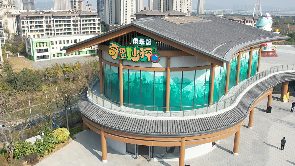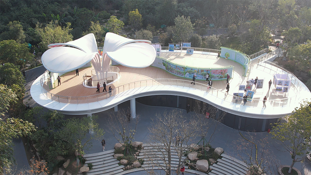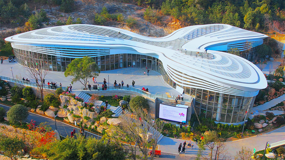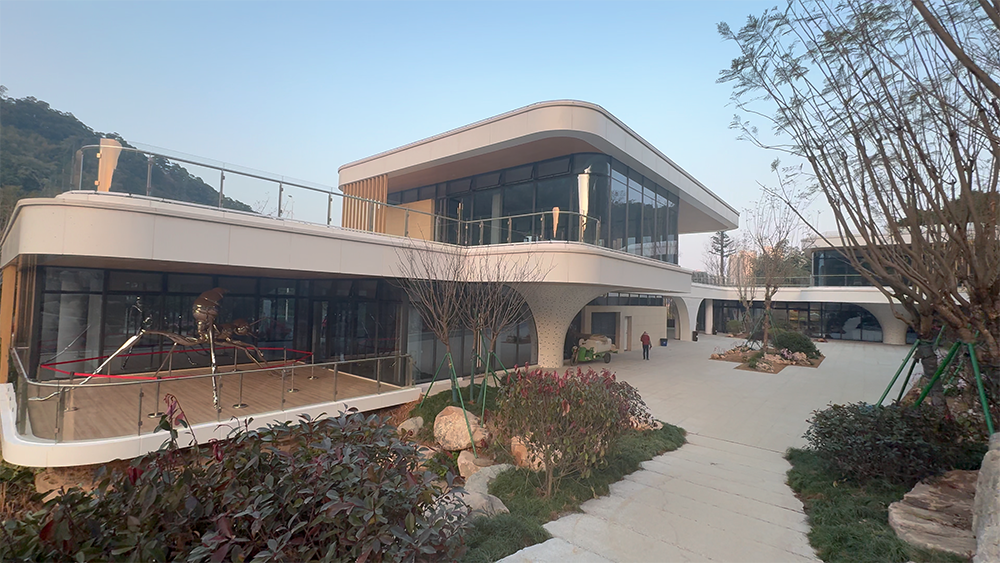 植物园项目的兰花温室,俯瞰效果是三朵兰花花瓣,屋面为幻彩蜂窝板与采光玻璃相间形成独特的花瓣线性,屋面高低起伏。立面为三个椭圆形玻璃幕墙场馆,并且在玻璃幕墙上部设计了高低起伏的幻彩蜂窝板飘带环绕于场馆外立面。