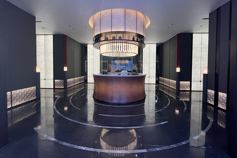 1.5.2m高弧形透光云石灯片工艺。以不锈钢骨架支撑0.3m宽、0.04m厚的弧形云石灯片,专用胶固定确保弧度流畅。通过灯光漫反射技术实现全域无光斑发光,光线均匀穿透云石肌理,兼顾结构稳定性与光影艺术。