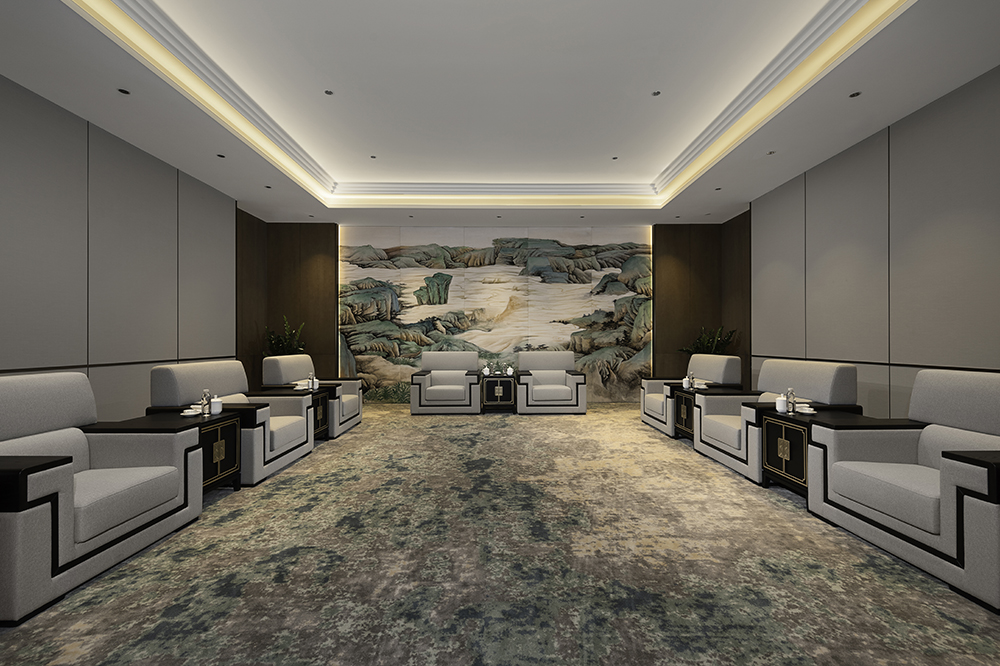 2.装修造型变化繁多,材料体系庞杂。具体表现为:一是天棚、墙面、地面及细部节点的施工图纸累计达300份;二是涉及材料种类涵盖17个大类、总计190种,对选材、工艺协调及现场管理构成显著挑战。