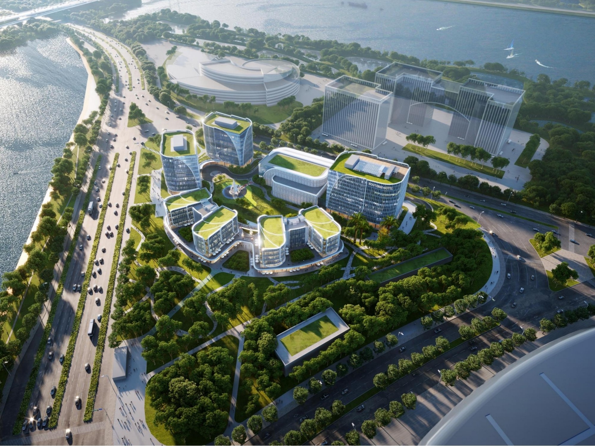 建筑群体设计概念源自对闽江畔层层帆影的印象,组合形成了“千帆竞发”的主旨。总体规划设计形态似茉莉花朵徐徐展开花瓣,呈向心性,花蕊是中心花园景观;酒店位于邻近会展中心的东南侧;两栋50米高度9层的办公双塔矗立于地块北端,朝闽江北岸的福州城市CBD展开门户形象。四栋五层的花园式办公楼向心展开布置在西南侧,并以多层平台连接,创造丰富的多层次空间。