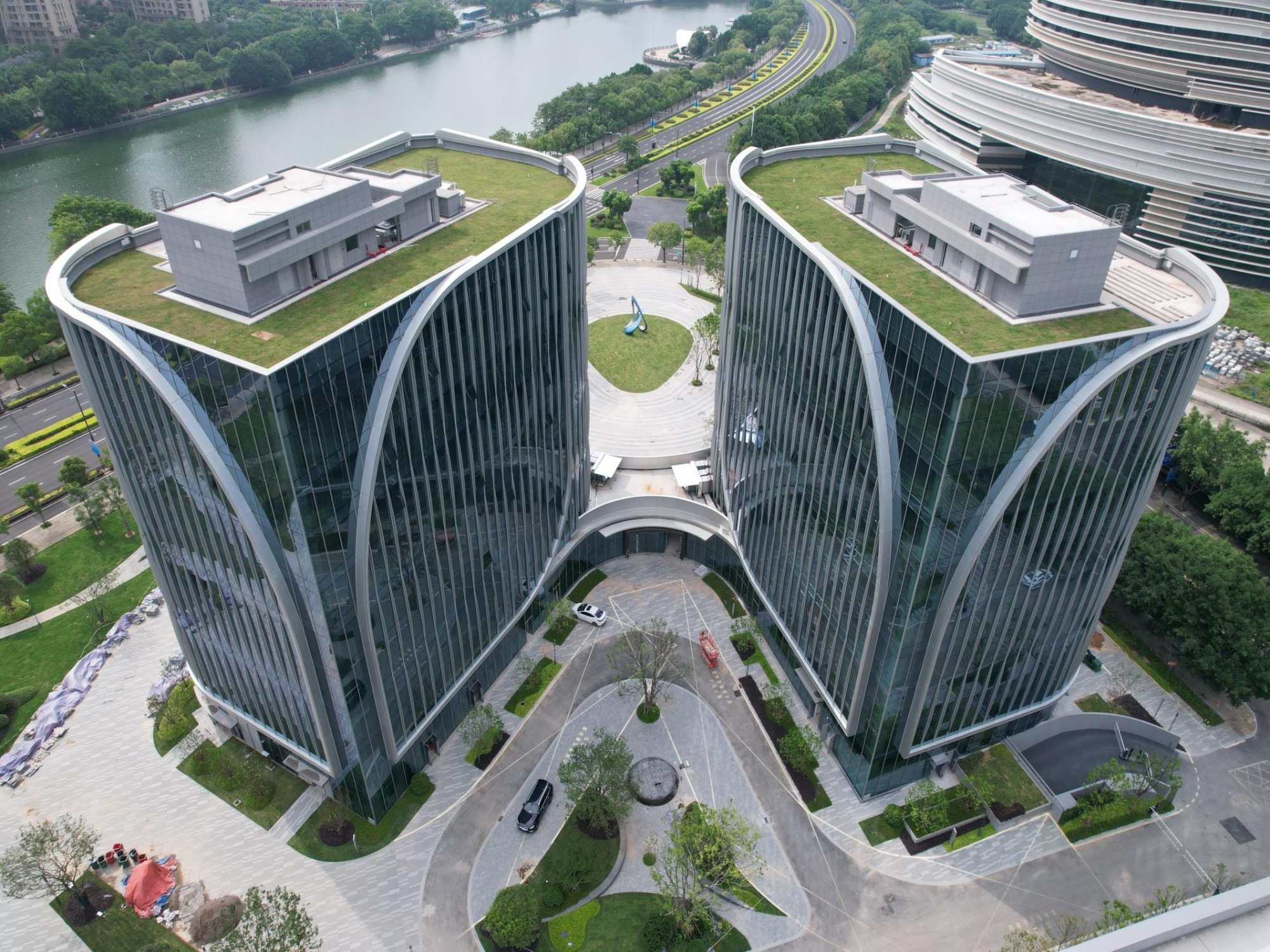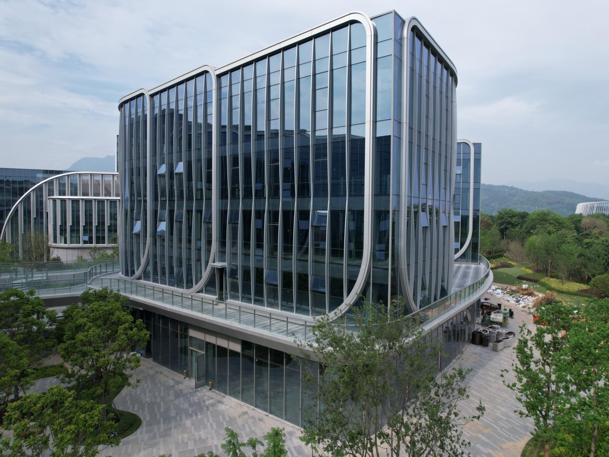 银白铝单板线条,以精致的花瓣状巧妙分格,优雅地环绕在每一栋建筑的外立面上。它们宛如细腻的笔触,勾勒出玻璃幕墙上一朵朵绽放的花朵,赋予建筑表面以灵动的曲线动态美感,不仅增强了建筑的立体层次感,更以一种艺术化的方式修饰了建筑外观,使其在现代都市中熠熠生辉。