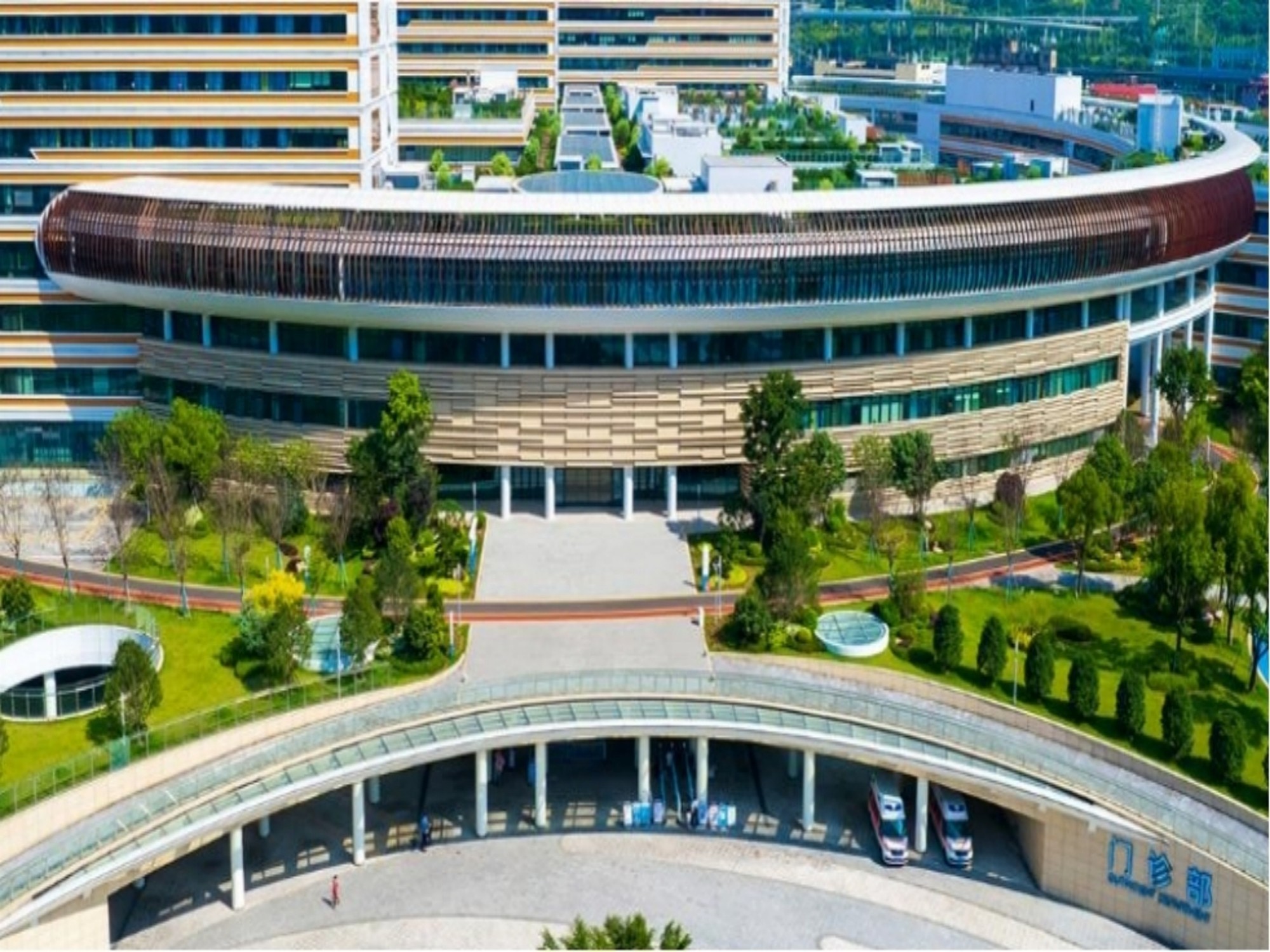 各建筑单体通过医疗主街相联,由南往北设有南病房楼、医技楼、北病房楼和科研行政医学中心,医疗街往东设有门诊楼和配套用房及教学交流中心,鸟瞰建筑的外轮廓近似半个圆环,构建出“虚圆实方”的整体建筑造型。