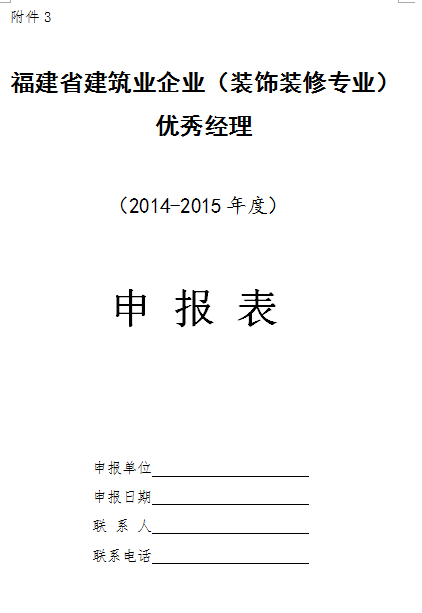 ㈠《2014-2015年度福建省建筑业企业(装饰装修专业)优秀经理申报表》(附件3);