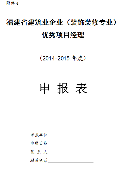 ㈠《2014-2015年度福建省建筑业企业(装饰装修专业)优秀项目经理申报表》(附件4);
