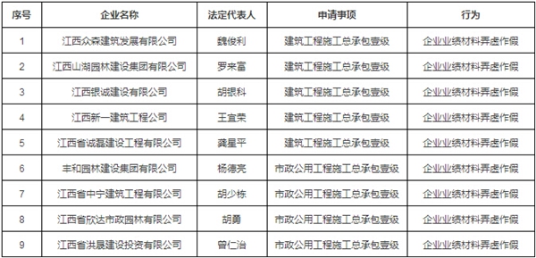 核心提示:近期,我部对江西省建筑业企业资质申报业绩进行了现场核查。经查,江西众森建筑发展有限公司等9家企业在资质申报过程中存在业绩弄虚作假行为。