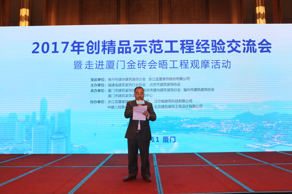 11月30日,由福建省装协联合北京市装协主办的2017年创精品示范工程经验交流会暨走进厦门金砖会晤工程观摩活动在厦门成功召开。中装协名誉会长马挺贵到会指导并发表重要讲话。北装协李杰峰会长、福建省装协蔡理怀秘书长、厦门市装协朱奖怀名誉会长分别致欢迎词。北装协、福建省装协、厦门市装协、泉州市装协会以及福州市装协领导及各协会组织的会员单位技术骨干人员共计600多人参加会议。会议由北京清尚建筑设计研究院副院长曾卫平主持。