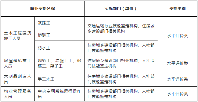根据2017年9月人社部公布的最新版“国家职业资格目录”,技能人员职业资格共有81项,由住建部门负责实施的有以下几项: