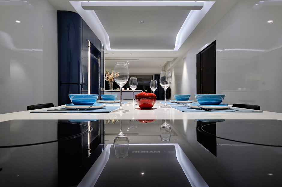 踏着起伏的波浪而行,客厅的另一端是餐厅。设计师在平面规划上,尽可能地打开空间,形成空间延展极强的室内格局。餐厅色调以纯白为主,在灯光的映射下显得通透而整洁。造型新潮的黑色餐椅与墙上简约时尚的时钟,使得整个餐厅更具科技和现代感。