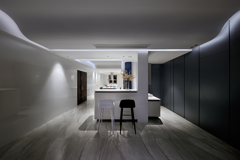 餐厅的另一侧是通向盥洗空间与休息空间的走道,设计师将空间的转换和色调的过渡安排得恰到好处,餐厅的白与走道的灰都能在这里找到最适合的方式和位置,走道的门被隐藏在灰色墙面的线条之间,黑白搭配的吧台椅与灰白对面的两侧空间相对应,形成蕴藏音律的钢琴黑白键。