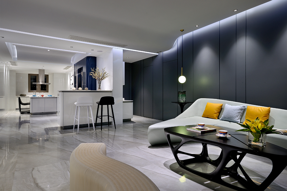 推开门,真的进入那个世界。不是热烈的澎湃,只有微风拂过的荡漾,洁白的天花板韵动优美弧线,灯带柔和的光线仿佛天光映入海水,这种线条和光影的运用使得空间极具律动,仿佛海波微兴,浪声入耳。