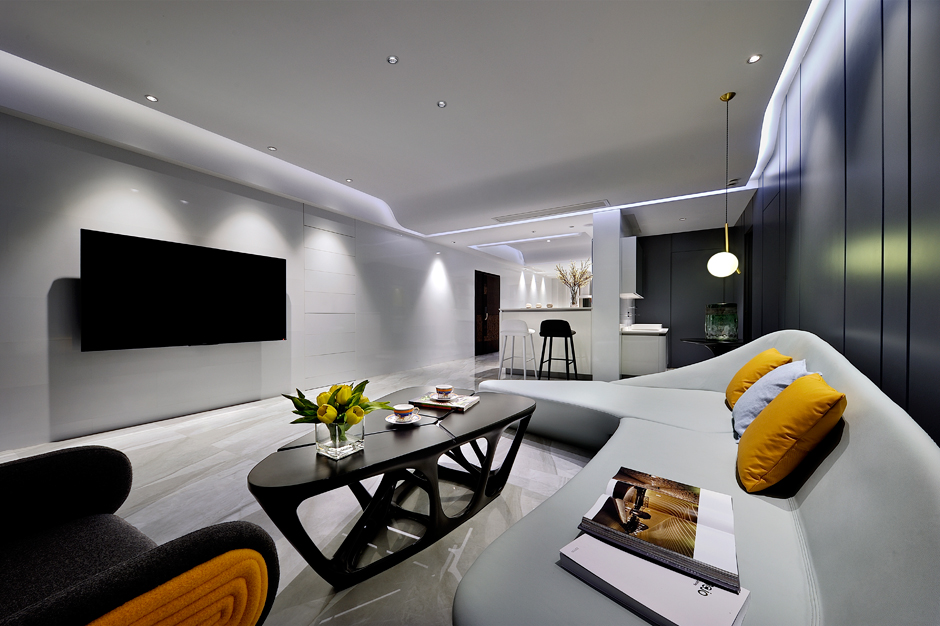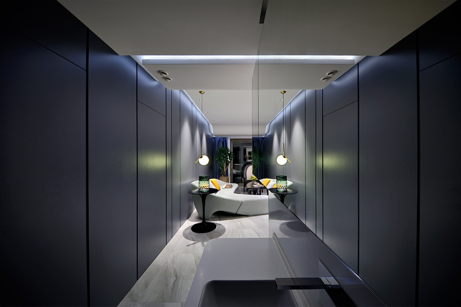 而那墙边球形吊灯,那样皎洁,好似那溶溶夜月初升海上,柔和的清辉洒在金属灰色的墙面上,这种形与色的对比,光与影的组合,为极简的空间带入一丝神秘的璀璨。