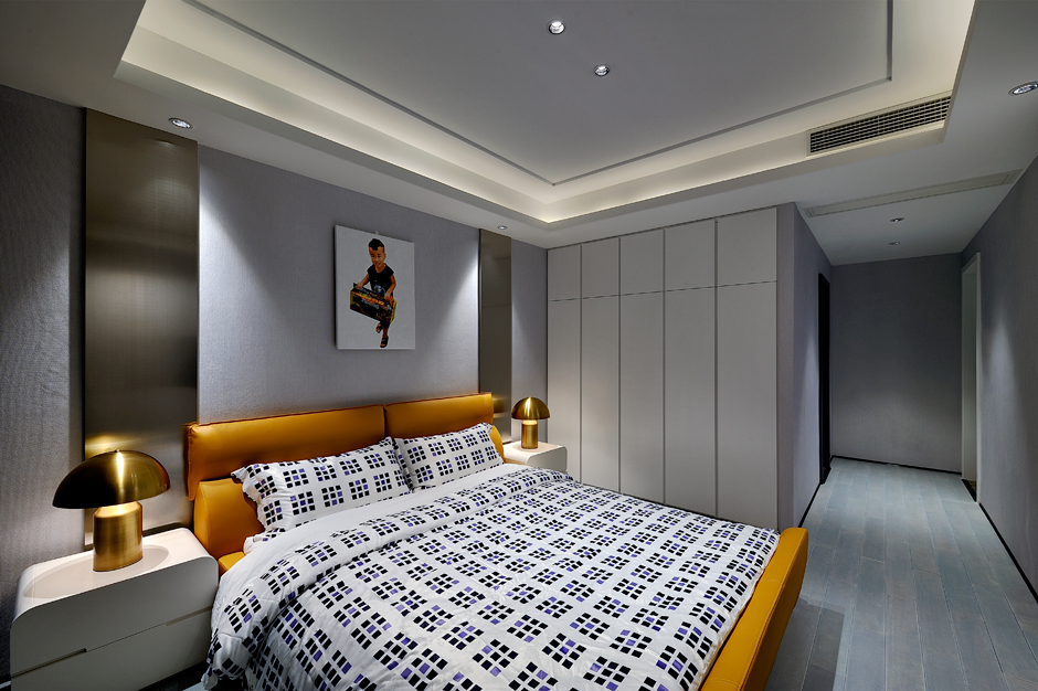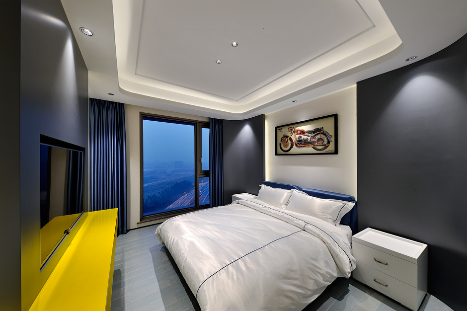 穿过灰色墙面,从波光粼粼的“时光之门”走出,就到了主卧。这是一个曼妙的世界:宽敞的卧室面朝大海,高低不同的布艺桩围着舒适的大床,它们像是一波波起伏的海浪,又像是一个个灵动的音符。
