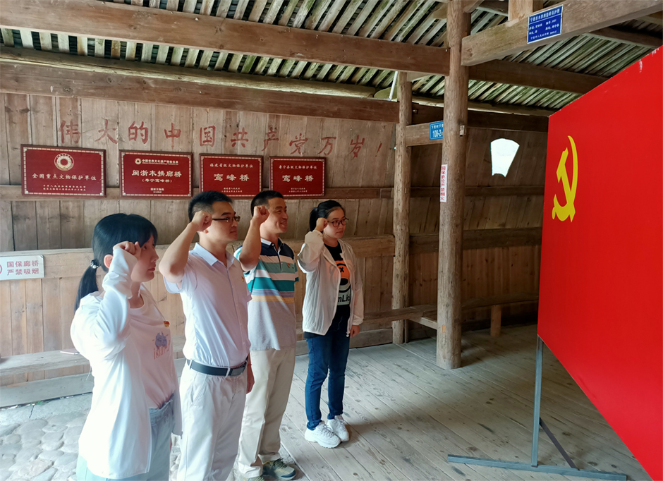 在鸾峰桥上,讲解员深情回忆习总书记当年在廊桥上现场办公情景。大家为总书记当年“不忘初心、牢记使命”的担当,不怕艰苦,心系群众,四下基层,四解四促,马上就办的工作风范深深感动。党员们在鸾峰桥桥头庄严地重温入党誓词,牢记入党初心,进一步坚定听党话、跟党走的决心。