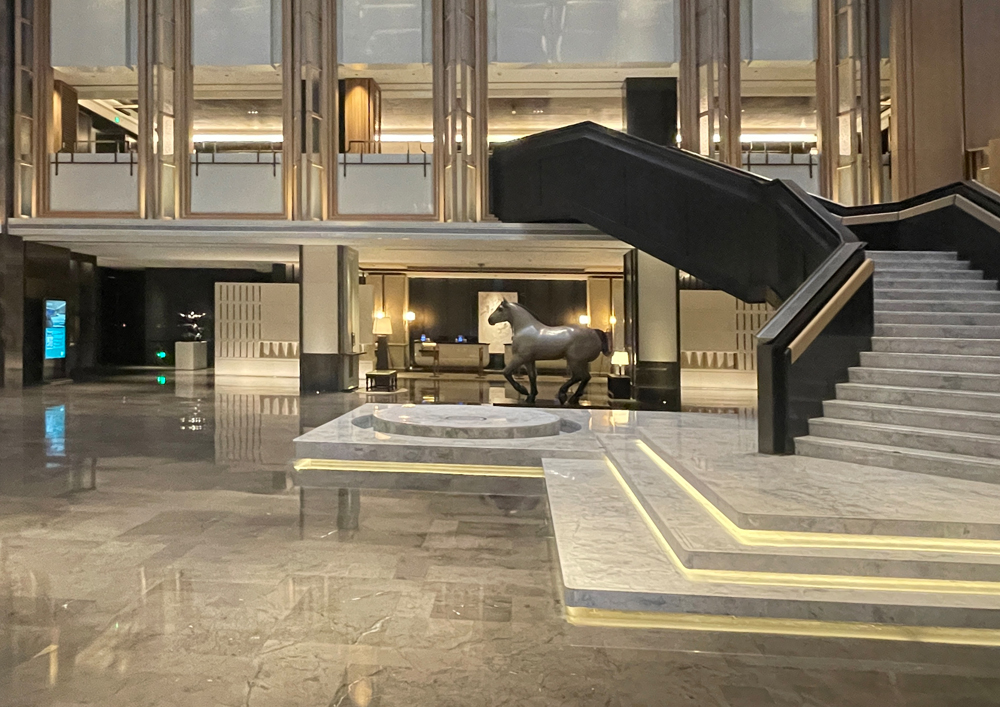 2、空间设计精妙:入口区域巧借东方园林布局手法,通过现代手法演绎曲径回栏,营造出层层递进的秩序感,使宾客在进入酒店的过程中,能够逐步融入环境,感受建筑的独特气场。大堂顶部天花板将中国建筑斗拱的形式艺术化表达,层叠有序,庄重肃穆;黑白的旋转楼梯作为空间交通及视觉的双向焦点,梯身蜿蜒,赋予空间独特的节奏美感。