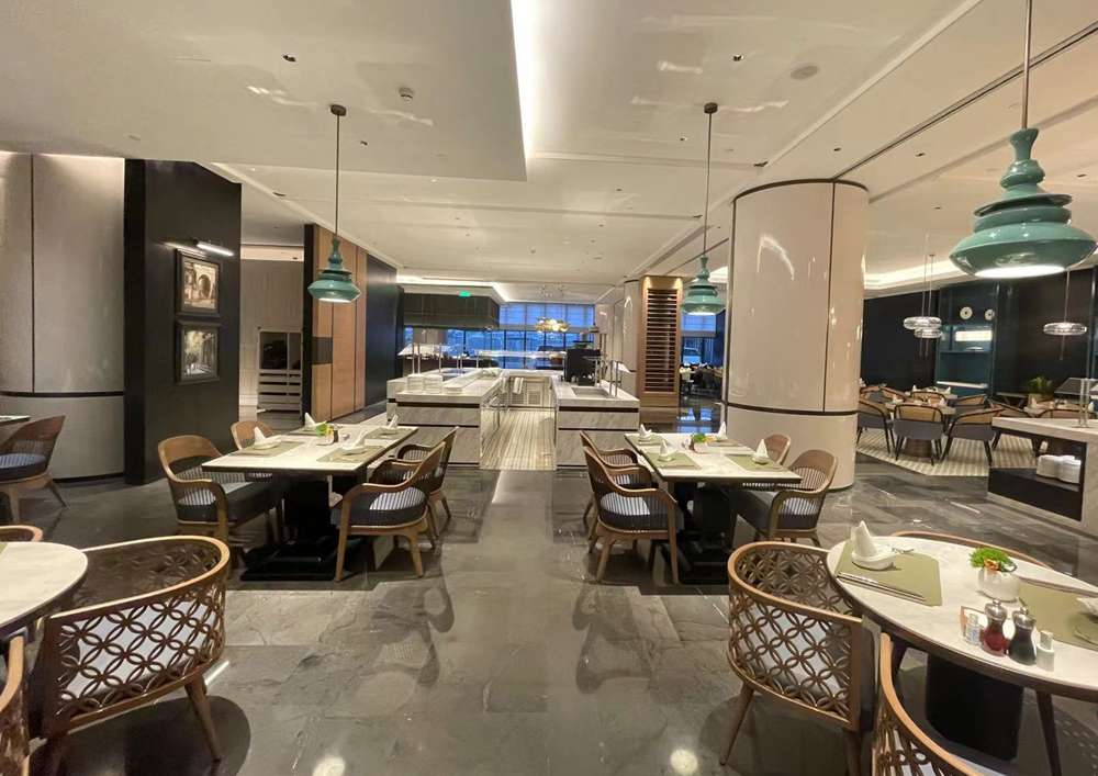3、装饰细节考究:大堂内的飞天壁画《归来兮》俏然凌空飞舞,既具古典美又现代新颖,成为大堂的一道亮丽新景。大堂吧引入石材景观墙,在灯光烘托下营造出浓厚的东方意境,白色景观墙线条干净利落又婉转流畅,结合点点光影,赋予空间独特而考究的内涵气质。