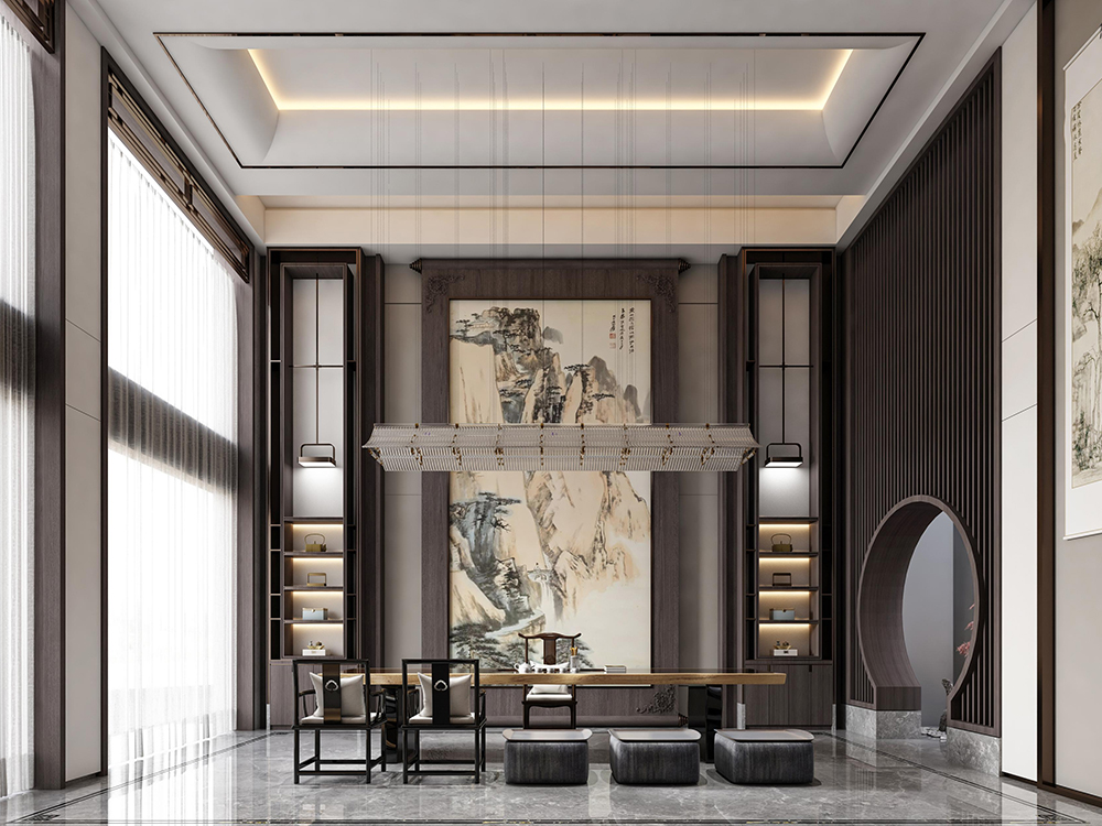 地下室茶艺空间:花格窗引光+中式元素点睛;双动线娱乐区以屏风实现视觉渗透;厅堂一体化拓展全景视野;庭院借光引绿,成就诗意栖居。