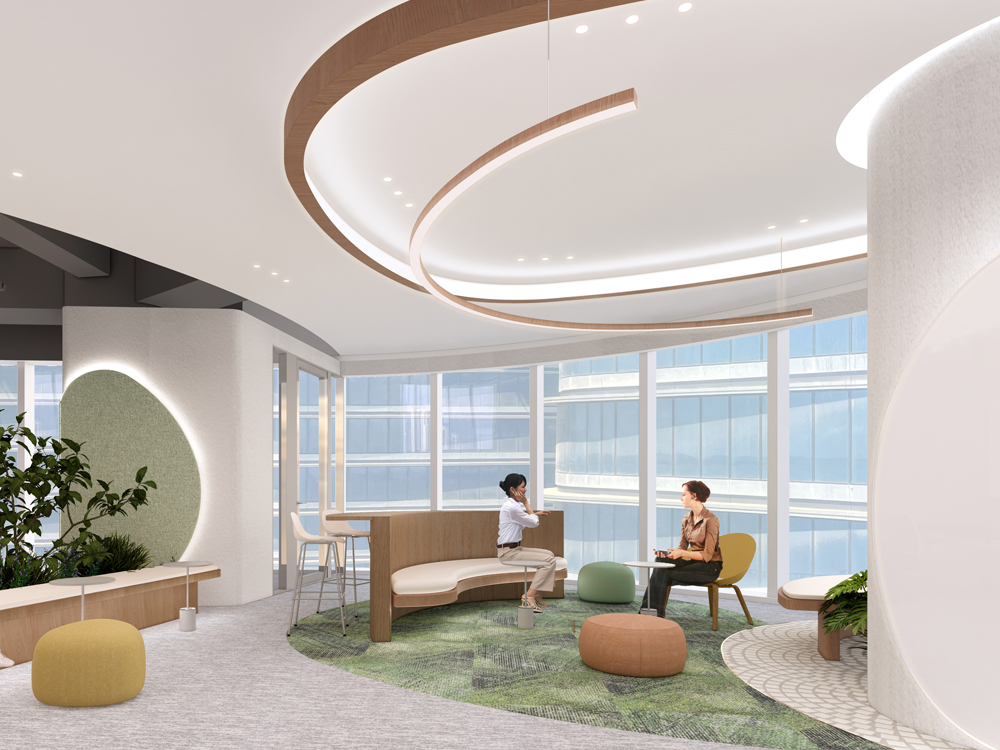 B、亮点:流动光色彩成为极具创新性的视觉亮点,流动光影增添动态美感与未来感,营造独特视觉与情境氛围,提升员工愉悦感,显著增强空间现代感与艺术价值。