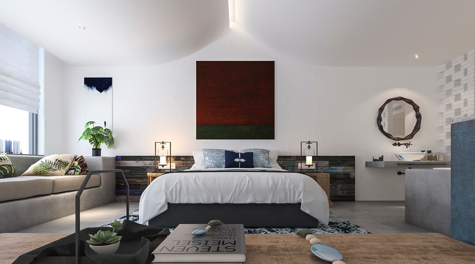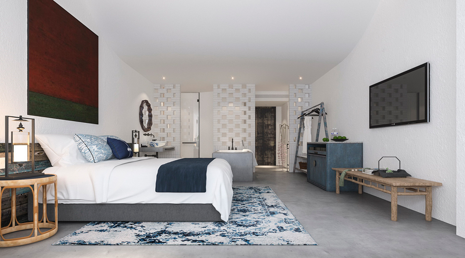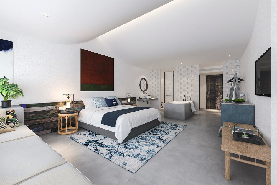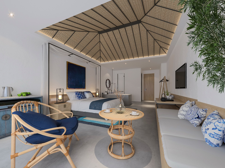 客房空间选用仿混凝土水泥漆、藤编壁纸及家具、色彩丰富的软装搭配,使得空间安静舒适而又温馨,充满家庭氛围,正是周末休闲度假的好选择。