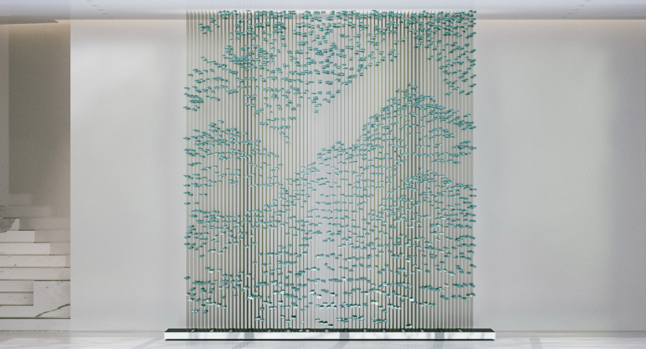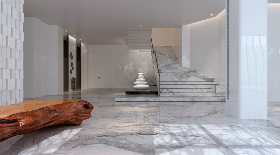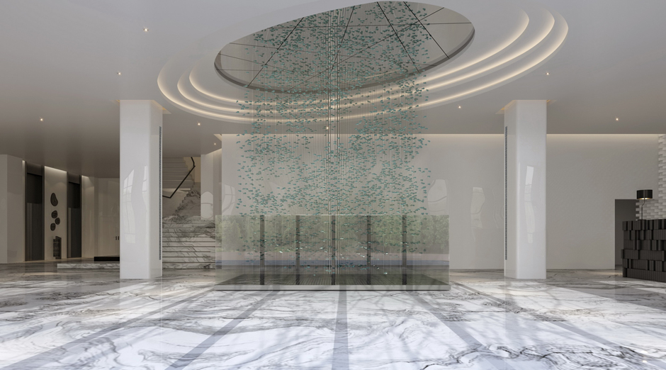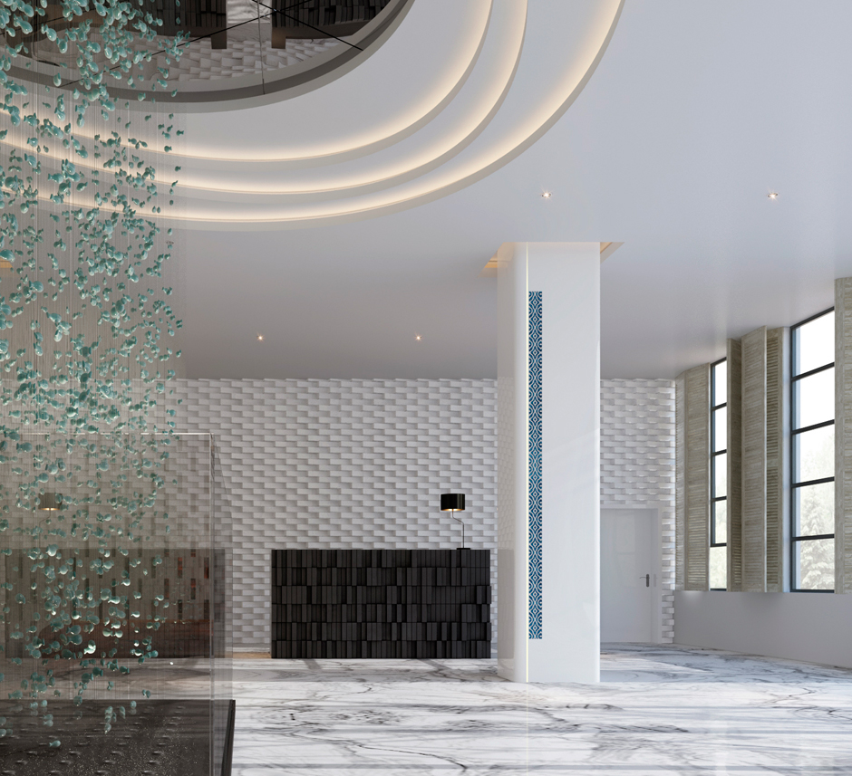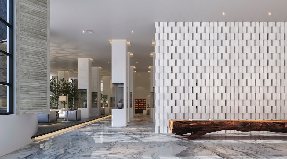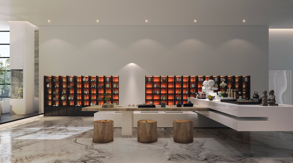 本案是位于泉州德化的陶瓷主题酒店,德化制瓷历史悠久,其白瓷做工精良,艺术性极强,被外国人称为“中国白”。设计师用定制的白色陶砖为底,黑色陶砖的大堂服务台及青花的竹麻家具、通高的陶瓷展示柜点缀期间,投影灯在白色墙面形成水纹般的律动,大型陶瓷装置“山水乐陶”吊灯矗立在大堂中间。设计师在空间中舍去重彩,顺空间而为,山水草木游弋其间,用材料本身的真实质感,用黑白浓淡水墨写意的手法,表达出一种淡泊豁达的空间气质。