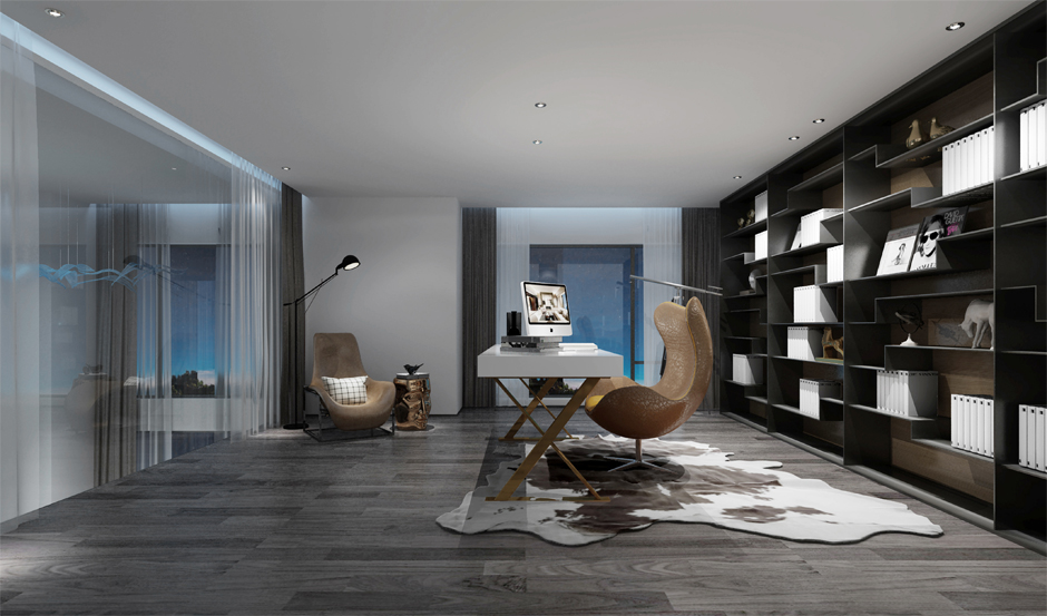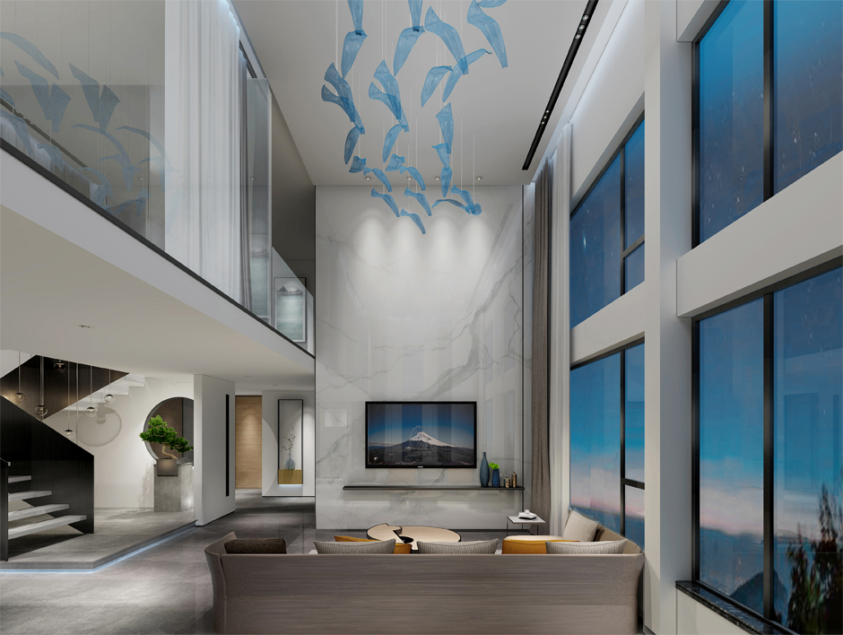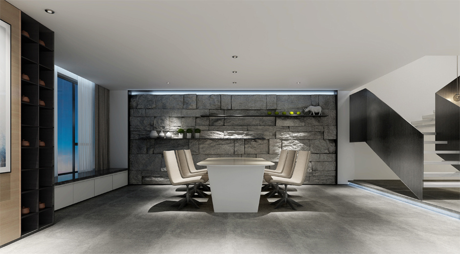 整体空间以简明的色块搭配,并以黑色金属包边效果,增加空间的构成感,每一个线条恰到好处的将空间延续。设计师巧妙的运用淡蓝色艺术灯饰,让楼上楼下空间相呼应,温柔和谐的灯光效果,增加空间的神秘气质。会议室设计打破了入口空间及会客厅简明的色块关系,运用粗犷的石材机理元素与周边空间进行强烈对比,不多不少,增加空间的厚重感。