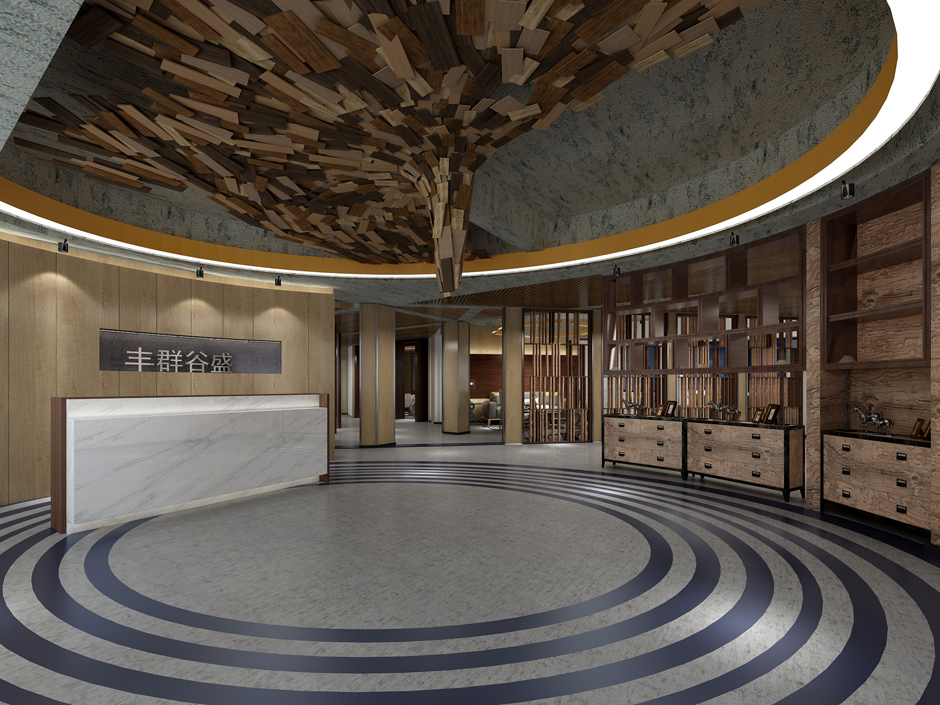 本案设计重在节约成本及材料运用上,门厅处为本案设计重心,布局上采用圆弧形设计。结合45度切线设计形成撬动地球的形态。让空间多一份动态又能让视野开阔。天棚中心用废弃的生态板下脚料组合成异形,平面看是一个展翅高飞的雄鹰,正面看则像一个钟乳石。地面配以蓝色环形。给人以水波的感觉。从而营造水滴石穿的效果。设计效果与企业宗旨不谋而合。