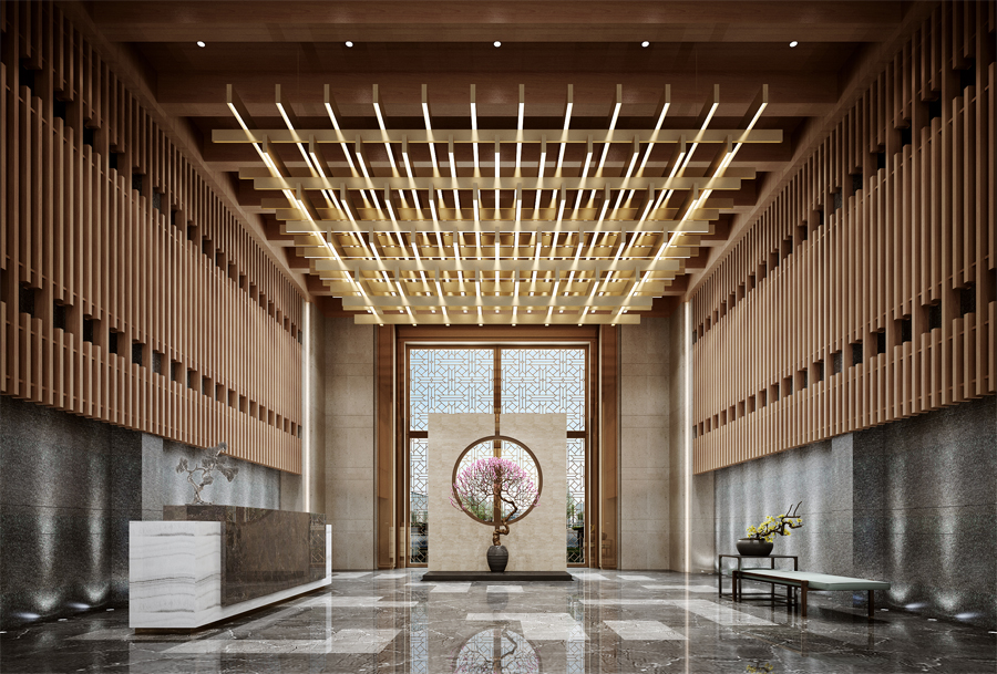 本设计以新东方装饰主义重新解读了传统与传承,融入当地特色的传统文化,将传统意境和现代风格对称运用,用现代设计来隐喻中国的传统文化。在西方世界里流传“没有中国元素就没有贵气”,体现了中式风格的独有魅力,大堂空间中那一抹红作为空间的点缀色,让空间多了一些灵气。